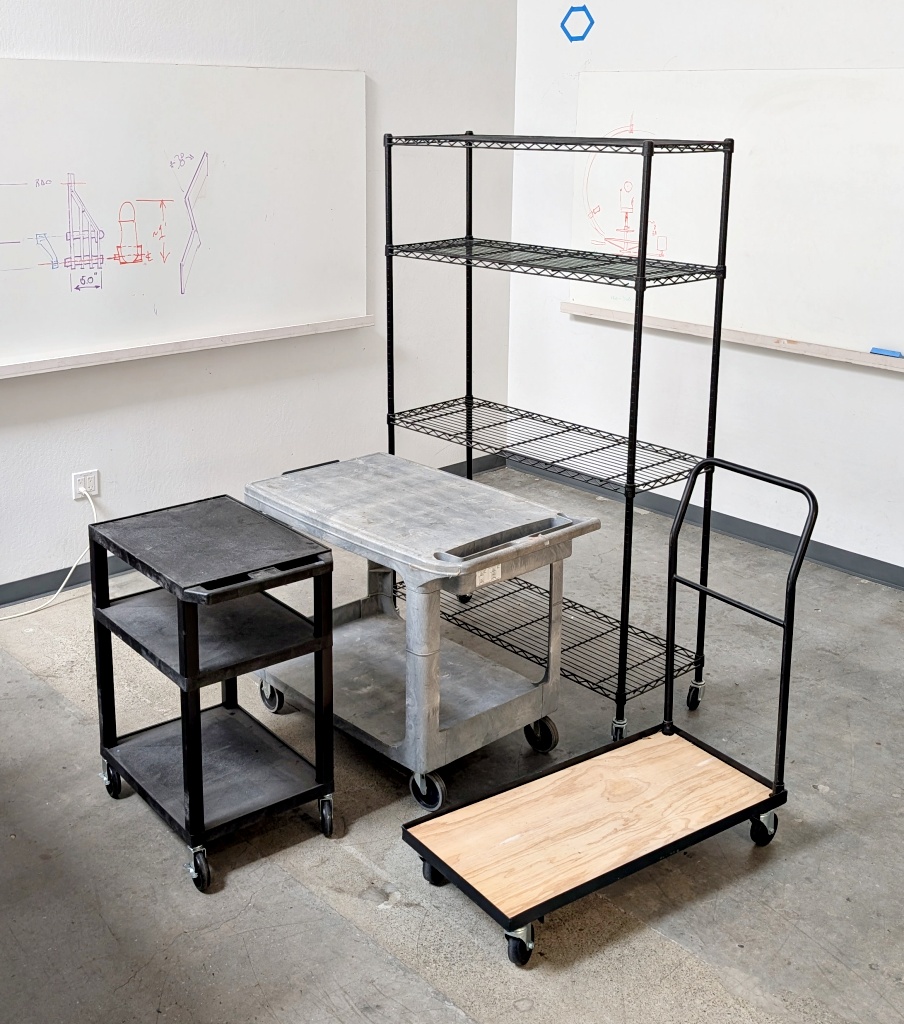 A typical 4' "rolling wire shelf" is shown in the back.
